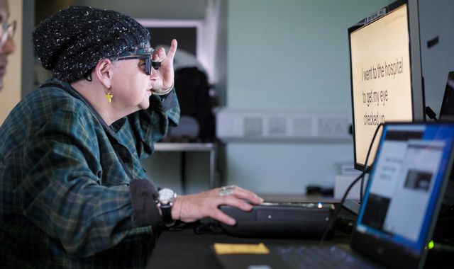 To see and read, patients wear augmented-reality glasses with a built-in camera, linked to a small computer on their waistband.